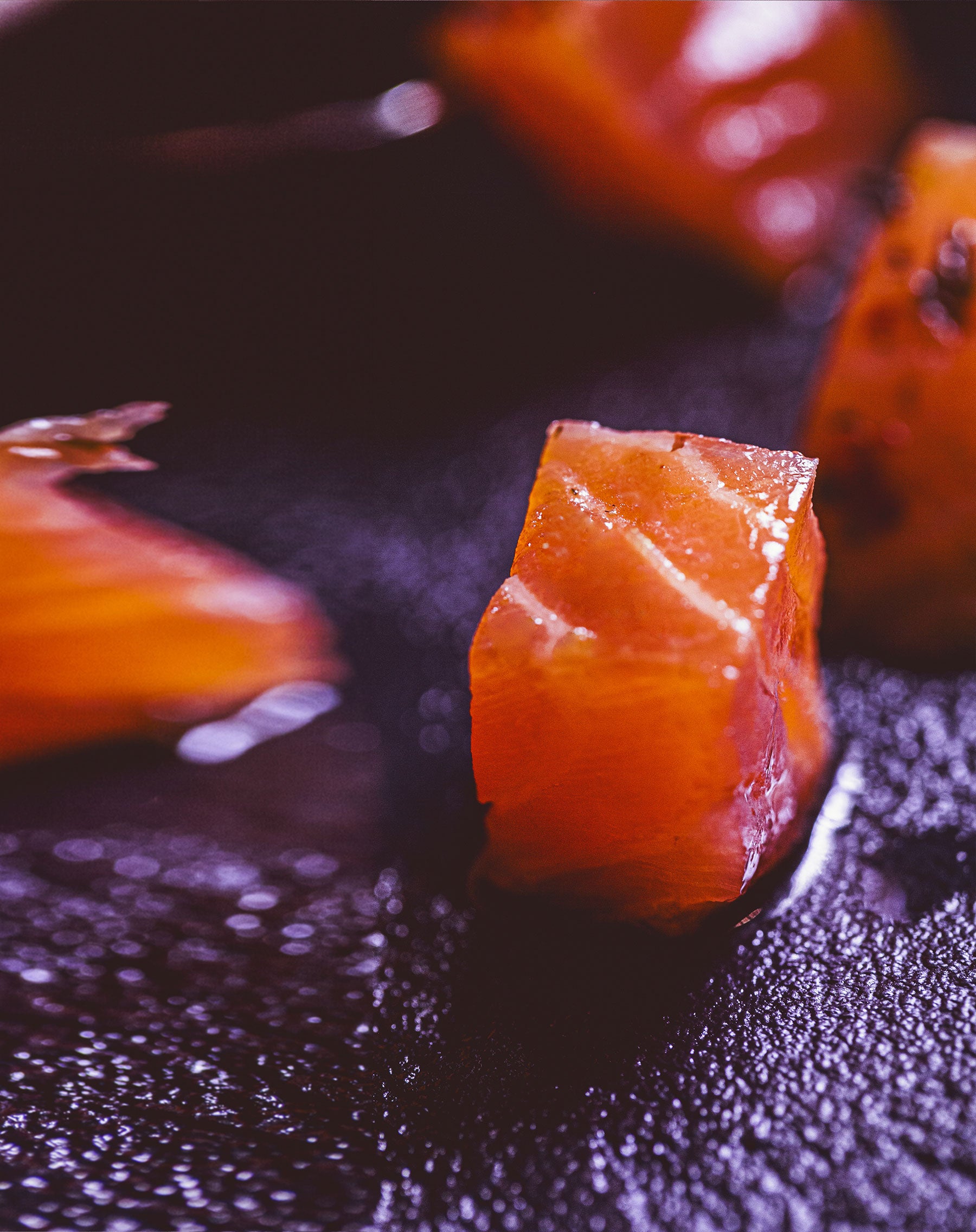 Nous utilisons un salage fin au sel de mer additionné d’une composition originale d’épices : poivre Timut du Népal, citronnelle, coriandre, graines de moutarde et sauce teriyaki.